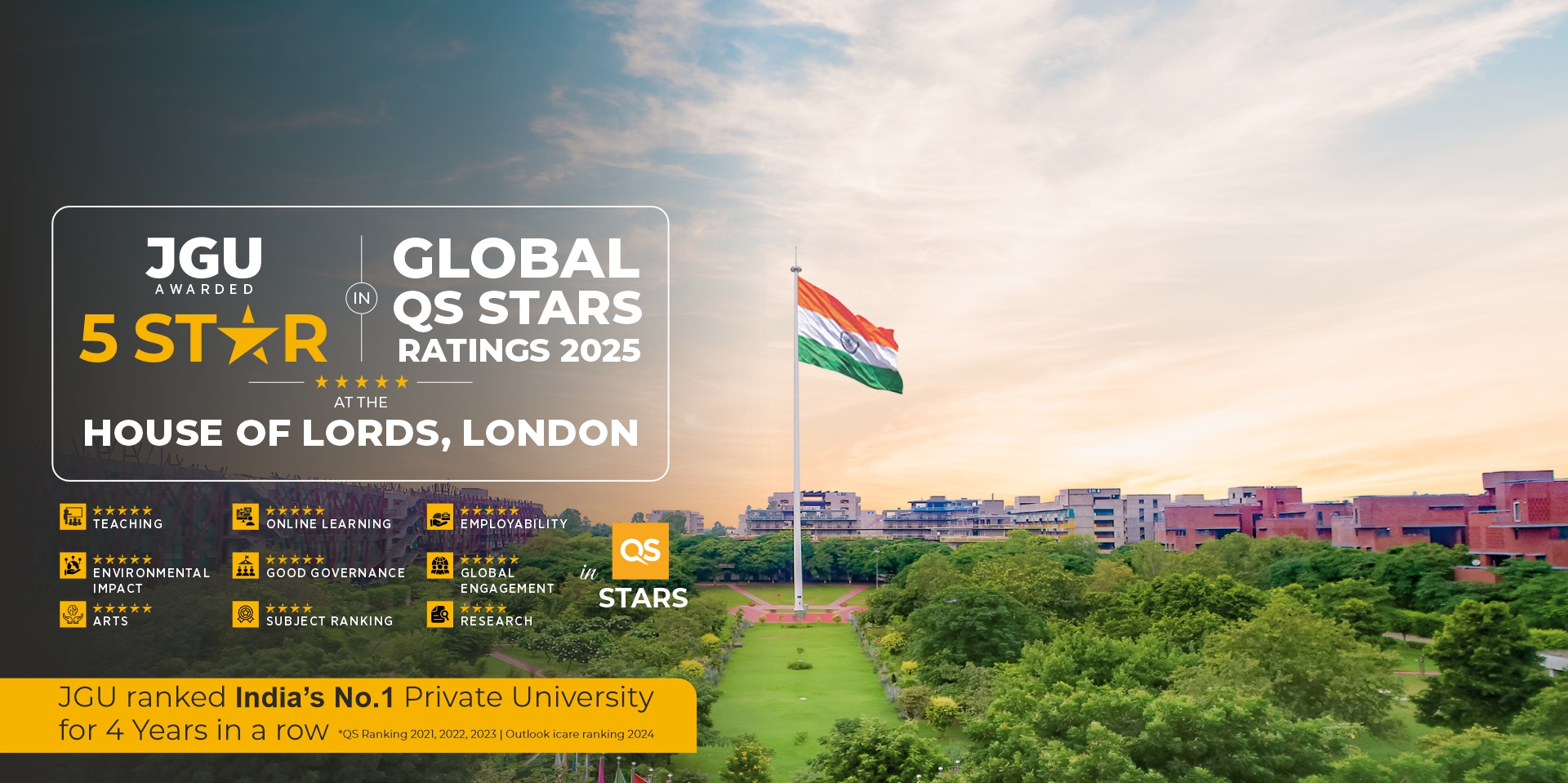 JGU is ranked Number 1 in the world with the highest overall score amongst all universities and awarded ‘Gold’ by the Times Higher Education (THE) Online Learning Rankings 2024. JGU has been ranked as India’s Number 1 Private University for three years in a row by the prestigious QS World University Rankings 2023. JGU has been recognised among the Top 150 universities globally under the age of 50 years by the QS Young University Rankings. JGU has also been recognised in the Top 500 Universities as per the QS Graduate Employability Rankings 2022.
